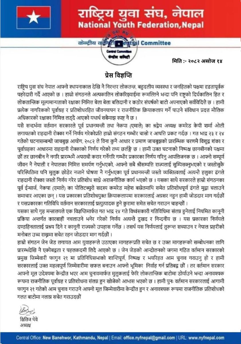 प्रेस विज्ञप्तिमा राष्ट्रिय युवा संघ नेपाल आफ्नो स्थापनाकाल देखि नै निरन्तर लोकतन्त्र, बहुदलीय व्यवस्था र जनहितको पक्षमा दृढतापूर्वक पहरेदारी गर्दै आएको उल्लेख छ ।