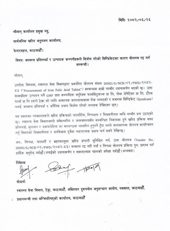 निष्पक्ष, पारदर्शी र भ्रष्टाचारमुक्त खरिद प्रणाली सुनिश्चित गर्न, उक्त बोलपत्र रद्द गरी नयाँ र निष्पक्ष बोलपत्र प्रक्रिया पुनः प्रारम्भ गर्न माग गरीएको छ । स्वास्थ्य सेवा विभागले गएको साउन ३० मा उक्त औषधी खरिदको लागि बोलपत्र आह्वान गरेको थियो ।