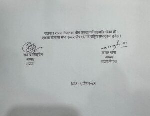 काठमाडौं । राष्ट्रिय प्रजातन्त्र पार्टी र राप्रपा नेपालबीच एकताको सहमतिमा हस्ताक्षर भएको छ ।